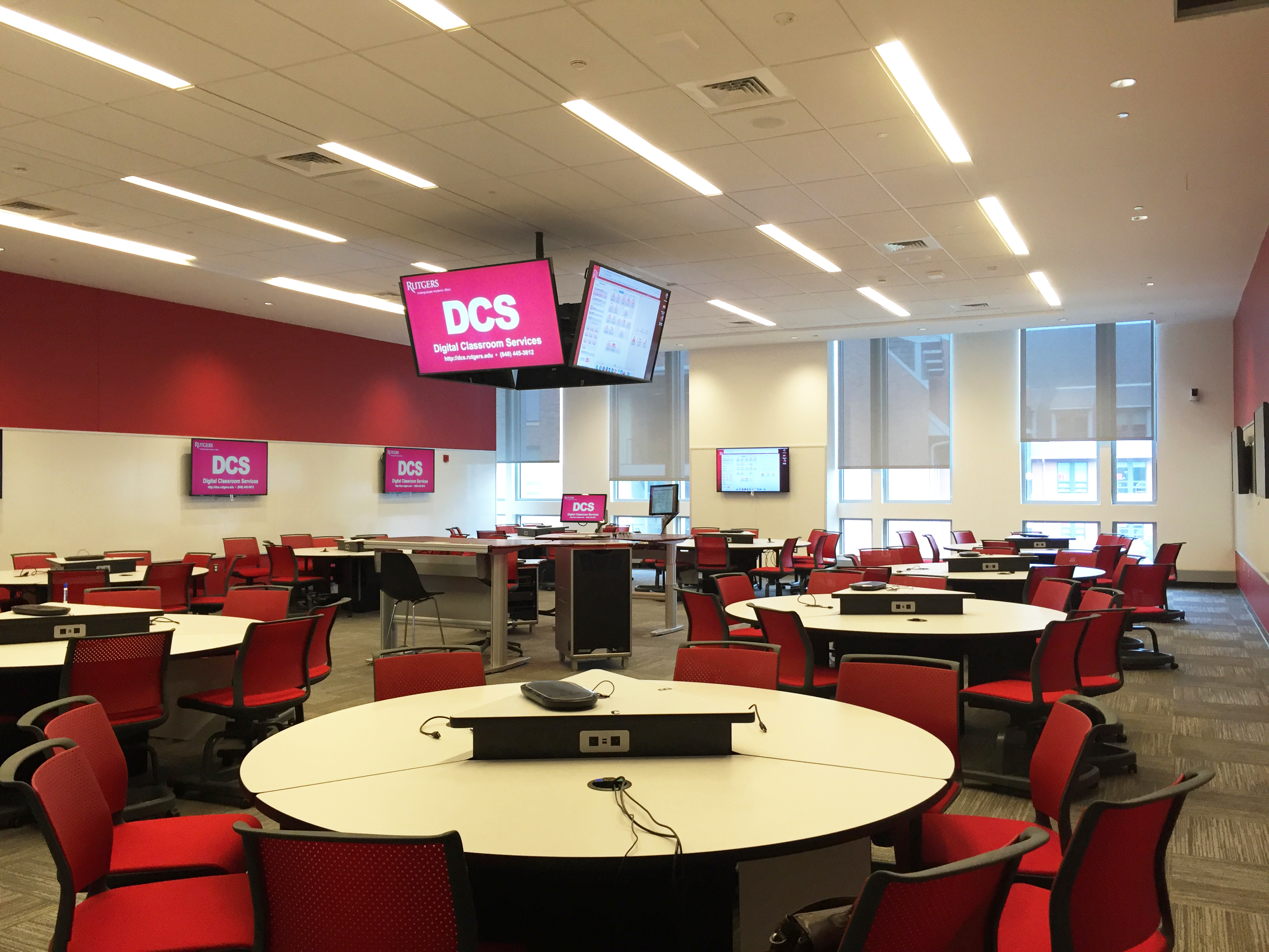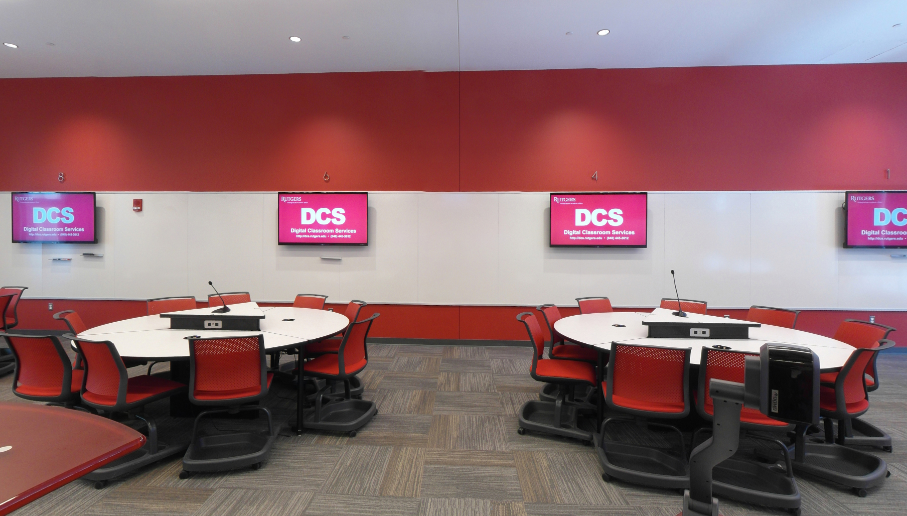 These exciting new classrooms were designed for student engagement and collaboration and are based on the feedback and research of Rutgers faculty and the Digital Classroom Services team. The goal of this collaboration-based learning is to get students to engage with material, test their knowledge of concepts, critically work through problems, develop their ability to constructively dialogue and work with others in groups. Students sit at large Cluster tables of nine which have power outlets and wired connection points that can be used to send laptop, phone, or tablet images to a group monitor. Students can also work on wall-to-wall whiteboards or at their tables using hand-held whiteboard tablets. Rolling seats with bag and water bottle storage enables students to easily partner up and form different groups to engage in collaborative tasks. The centrally located instructor station is connected to each group's monitor as well as to the four large displays facing each side of the classroom from above the instructor station. Using Mersive screen sharing the instructor can send their presentation material to any one of the room's 14 displays in the classroom. Faculty can also preview or share student images from group monitors to any combination of the room's monitors.