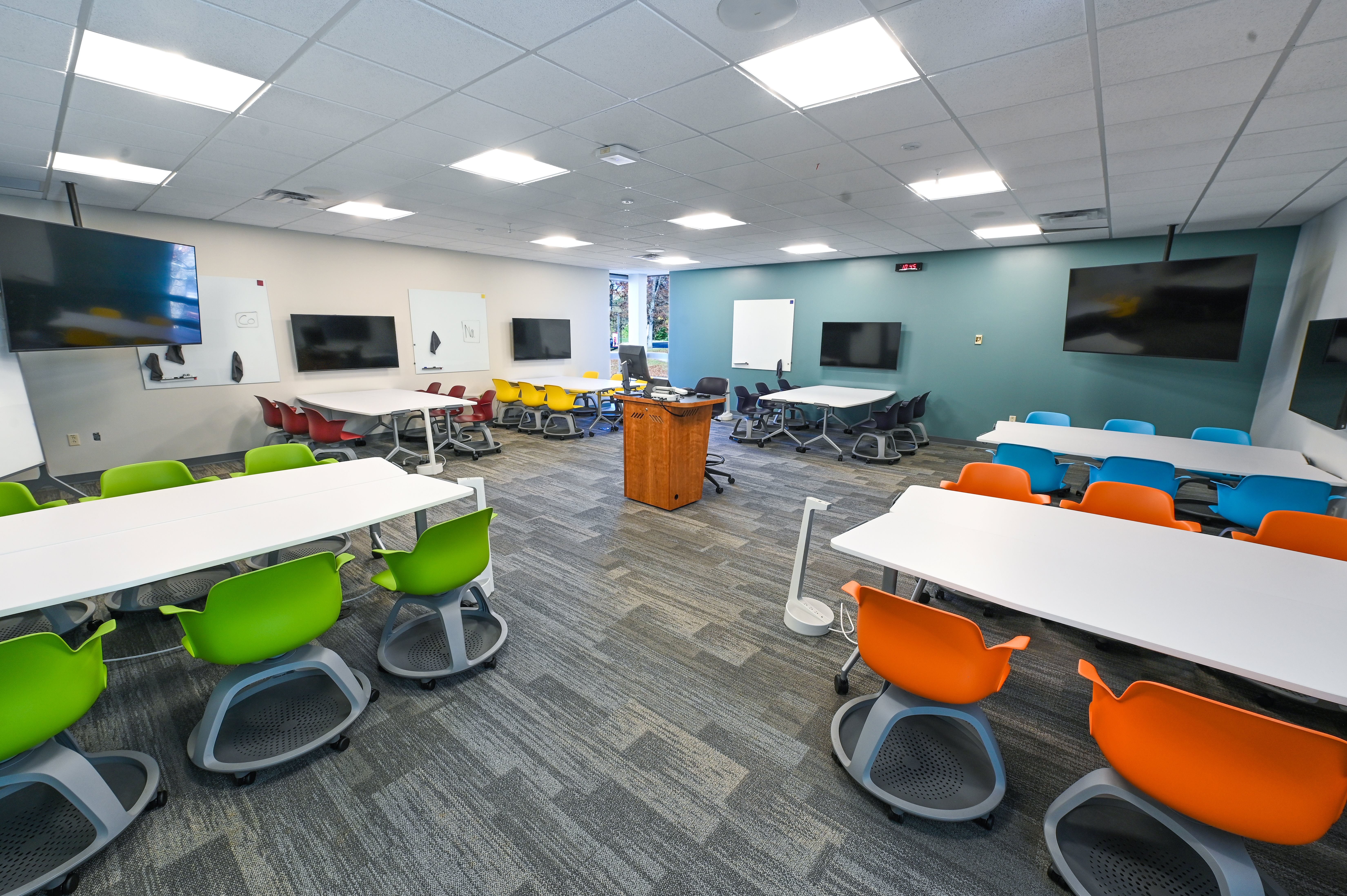 A technologically advanced classroom, designed with flexibility and collaboration at its core. The room is furnished with group tables, each accommodating six seats and two tables. These seating arrangements are highly mobile, allowing for easy reconfiguration to suit a variety of learning activities. Each group has a dedicated display fixed on the wall nearby, providing a visual aid that enhances the learning experience. All furniture, including tables and chairs, is movable, promoting a dynamic and adaptable learning environment.